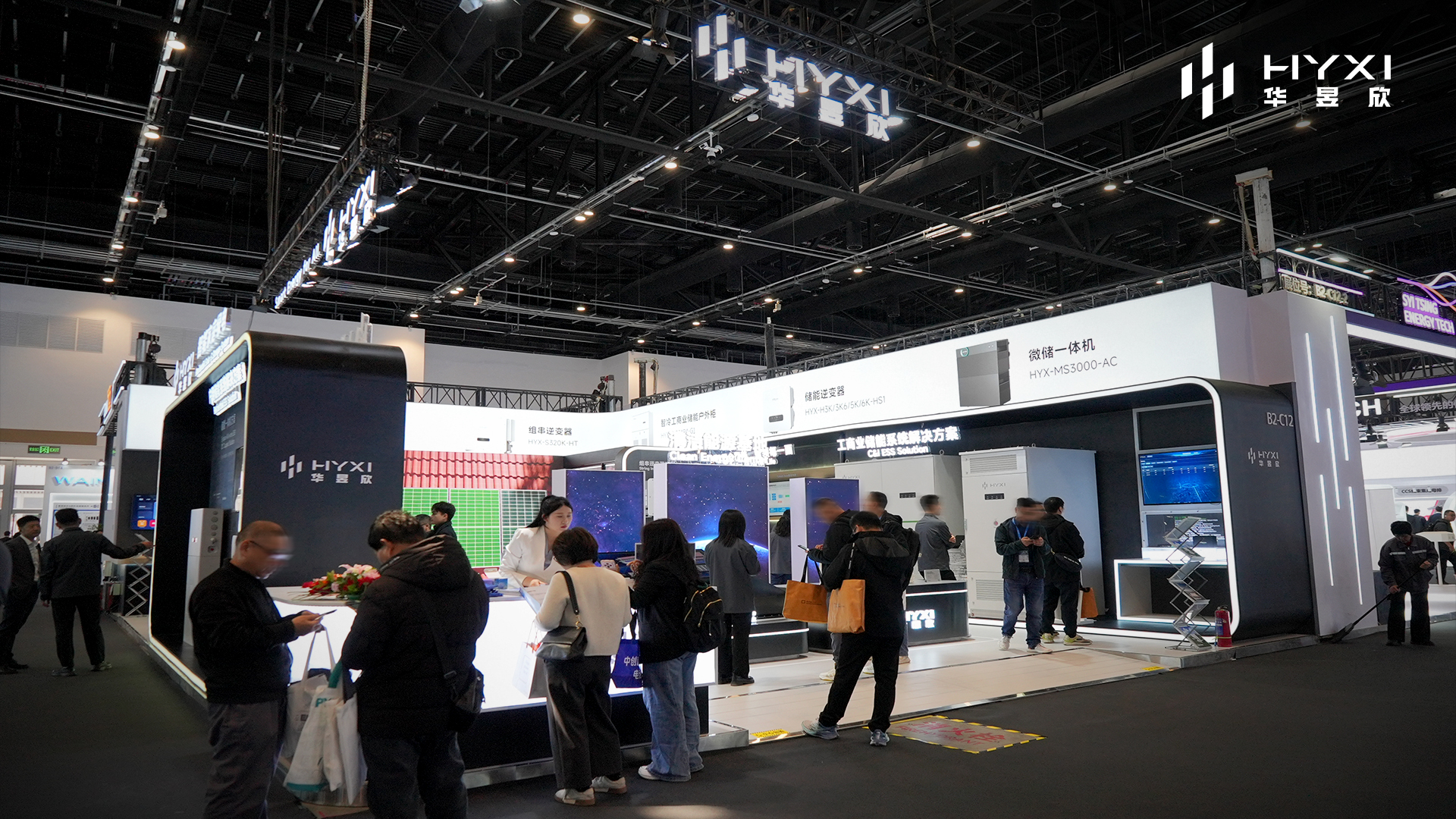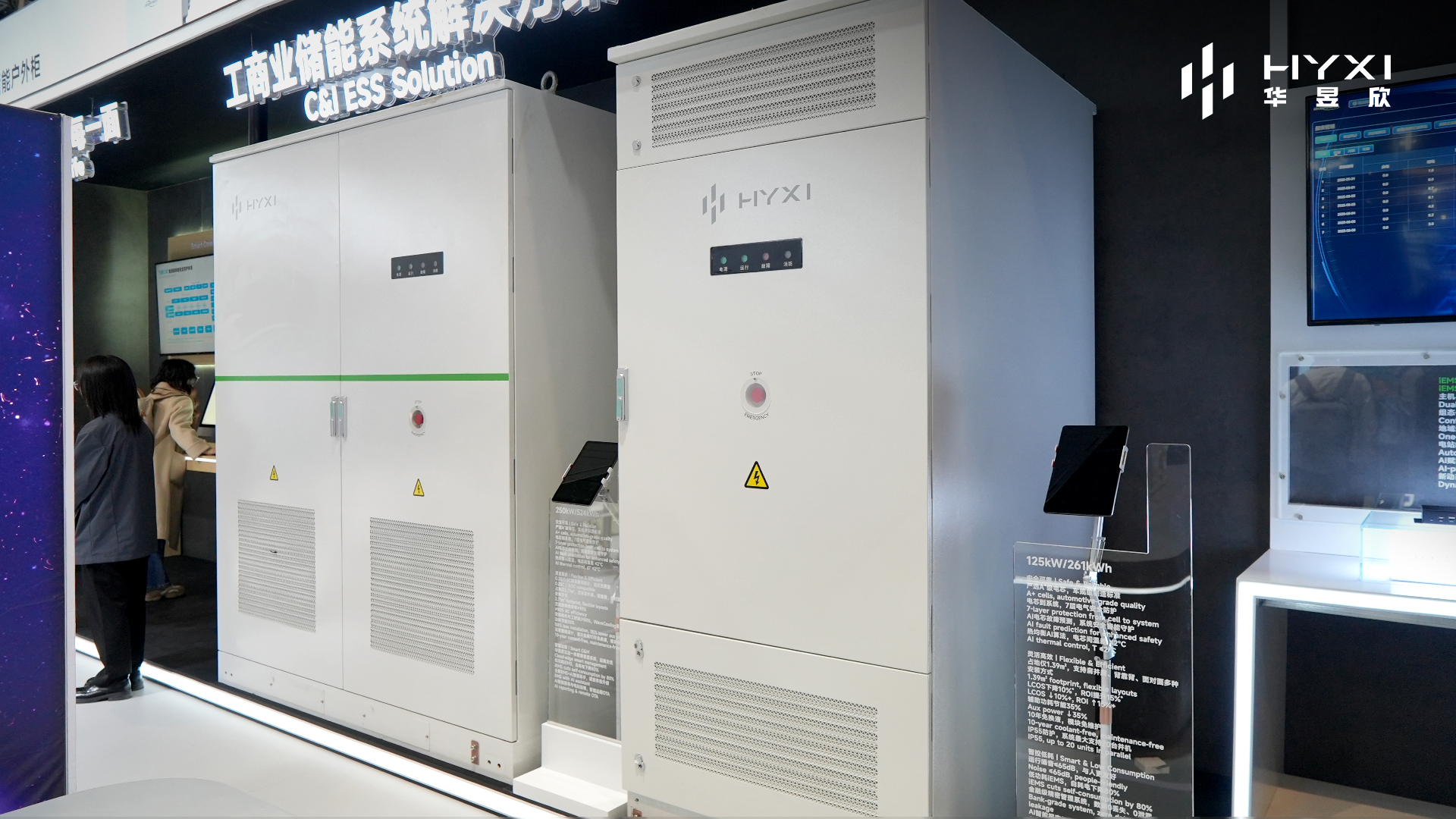展会现场,华昱欣在B2-C12-1展台集中展示了多款储能产品与解决方案,包括搭载iEMS 2.0能量管理系统的125kW/524kWh与250kW/524kWh液冷储能柜、HYXI Atlas 125kW/262kWh液冷储能柜及HYXI Halo微储一体机,系统呈现其在工商业及户用储能领域的产品布局与智能化能力,吸引了众多行业客户与合作伙伴驻足交流。