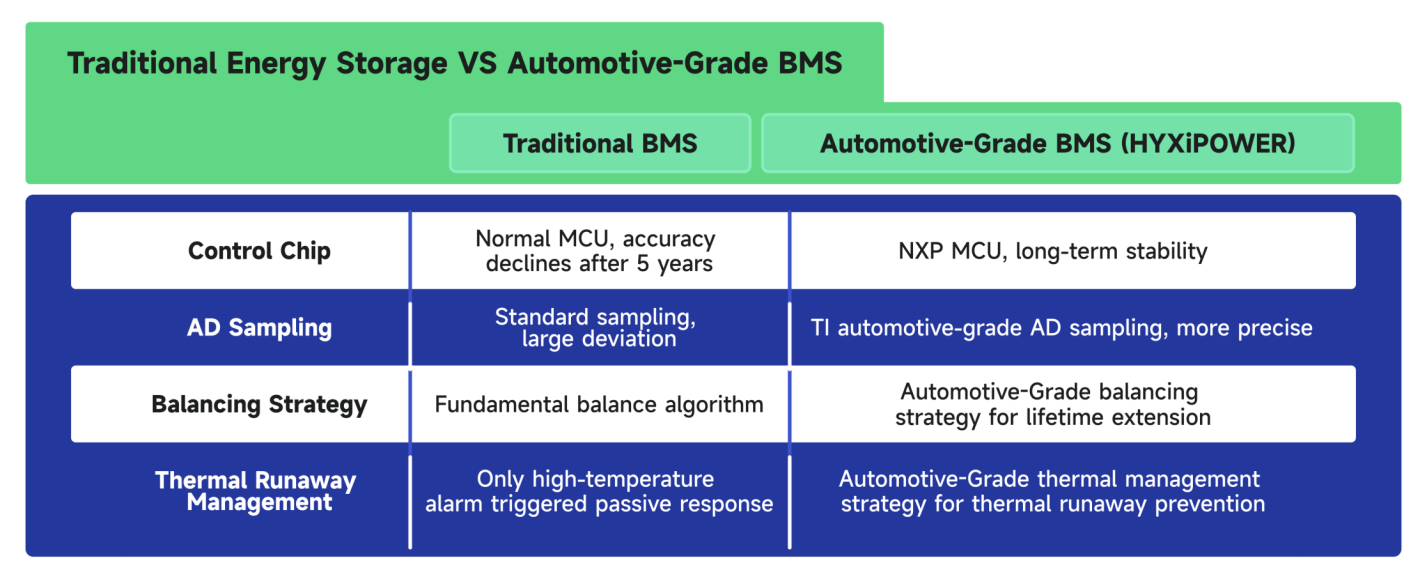 At HYXiPOWER, we’ve taken battery safety to the automotive grade level. Our advanced BMS technology incorporates all these protective features and more. We use premium components like NXP MCU processors and TI sampling chips for maximum precision. Our three-layer safety approach involves automotive-grade materials throughout: