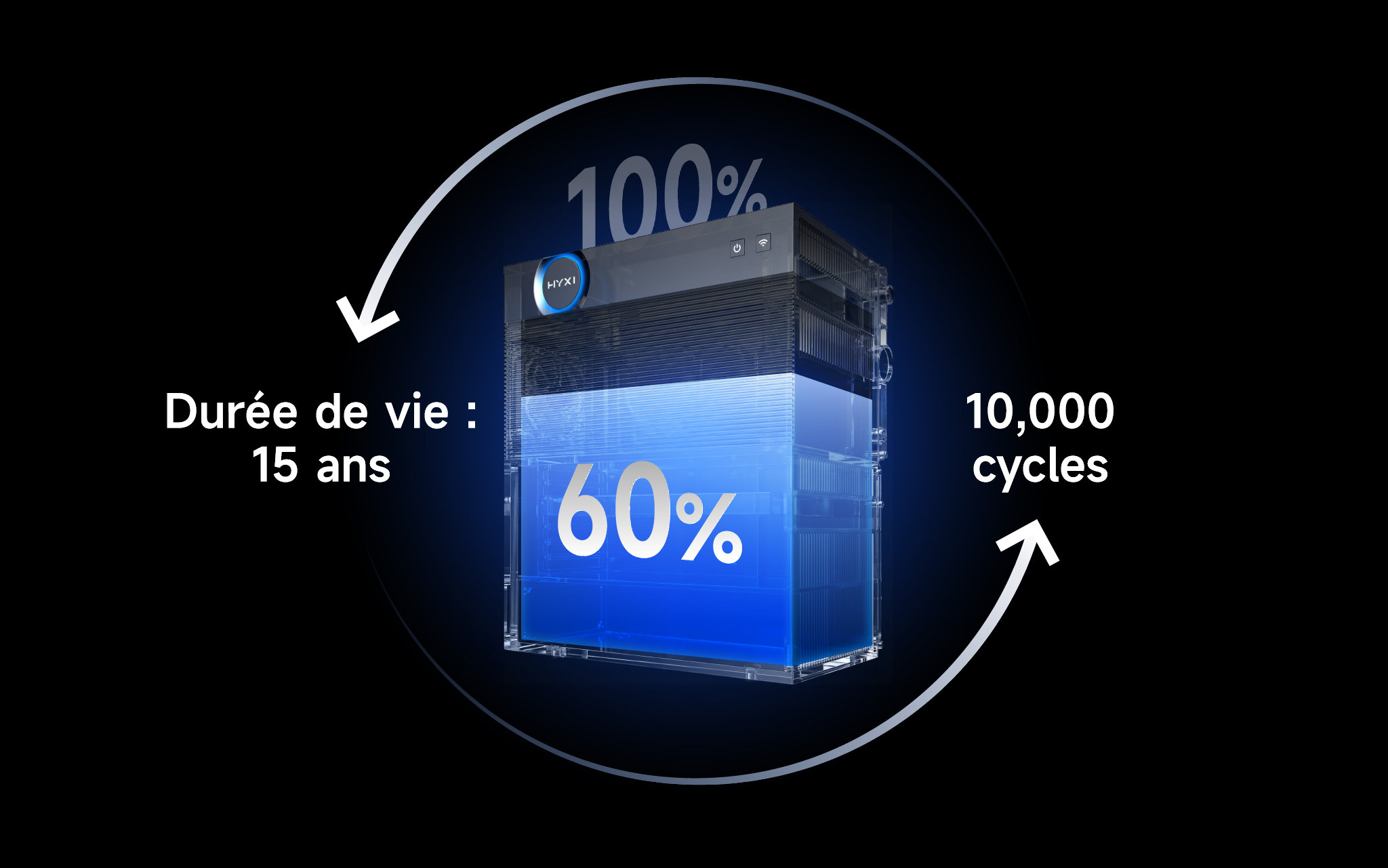 Fournit une énergie durable et fiable grâce à des batteries prismatiques LiFePO₄ avancées conçues pour une durée de vie de 15 ans, la garantie produit de 10 ans supporte jusqu'à 10 000 cycles tout en conservant 60 % de sa capacité.
