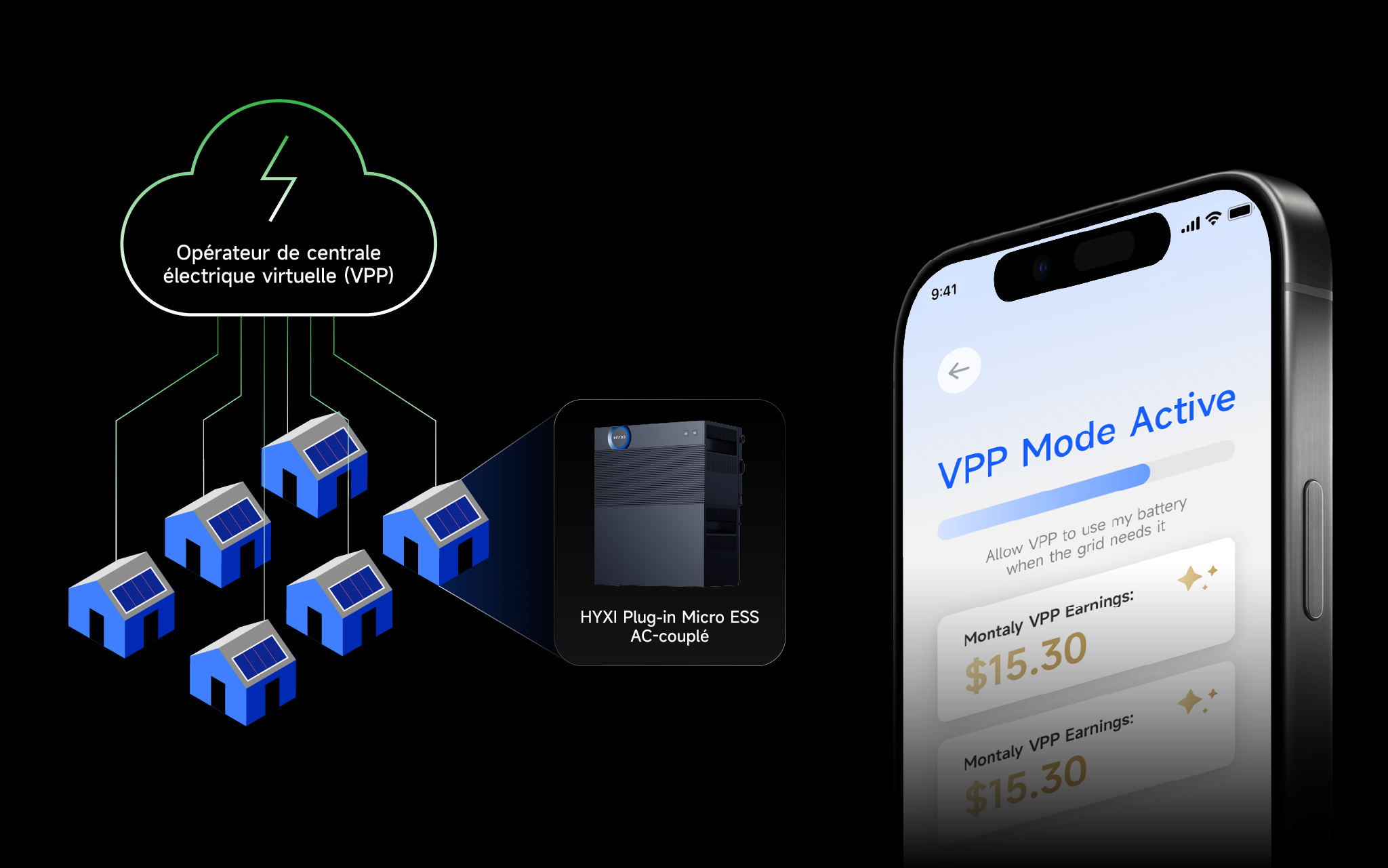 Maximisez vos revenus en tant que partenaires du réseau, en vous connectant aux opérateurs VPP autorisés via l'API de la plateforme HYXI Smart Energy ou un EMS tiers, tout en contribuant à la stabilisation du réseau électrique.